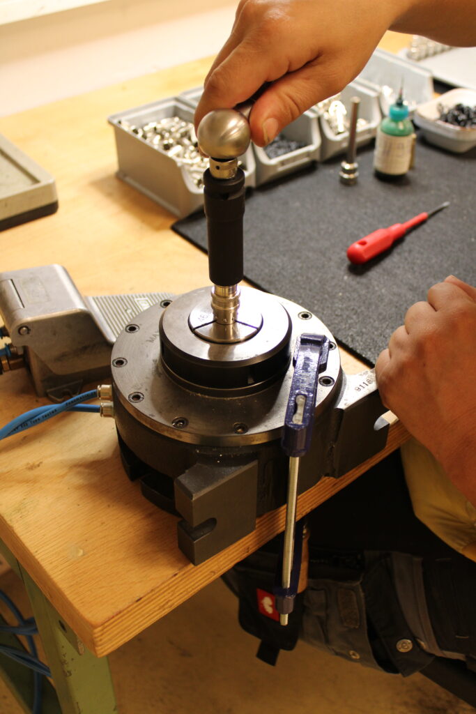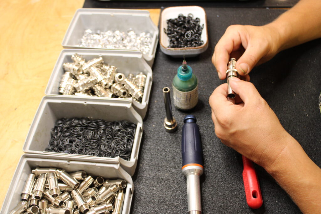 Die Kupplung besteht aus zahlreichen Kleinteilen und ist in verschiedenen Farbvarianten erhältlich – was nicht nur die Unterscheidung erleichtert, sondern auch besondere Anforderungen an die Montage stellt. Gefertigt wird ausschließlich per Hand mit Unterstützung eigens entwickelter Vorrichtungen.